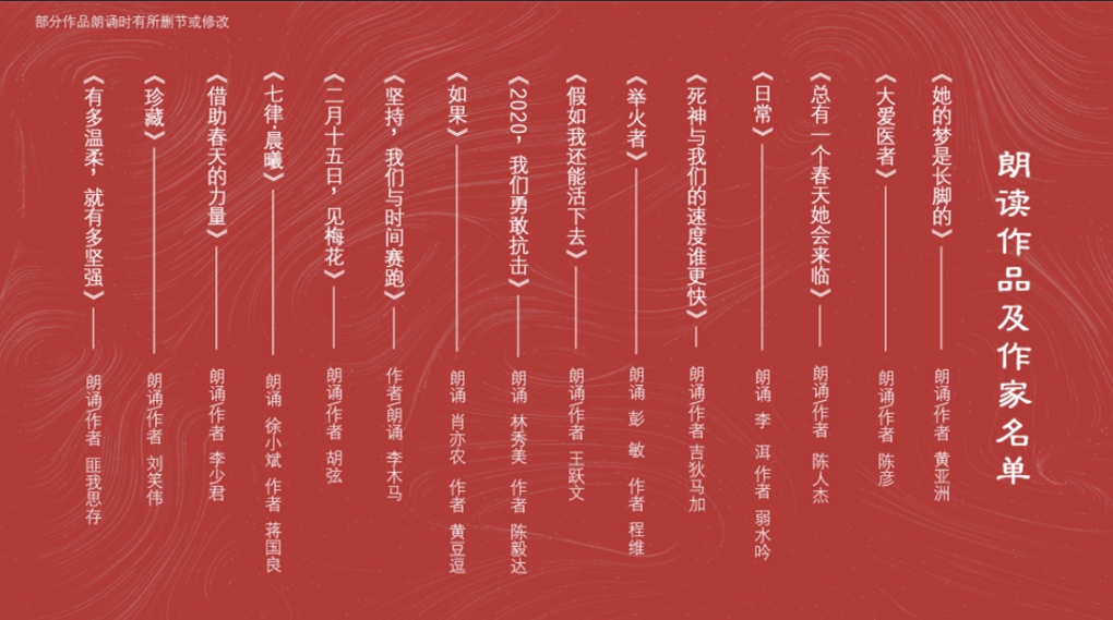3月10日起,由电竞竞猜官网精心策划、组织的“同舟共济 同心战‘疫’”主题作品线上诵读会在电竞竞猜官网、人民网、新华网等网络平台陆续播出。诵读会由“疫情来袭”“紧急驰援”“大爱逆行”“智慧勇气”“信心希望”五个篇章组成,邀请来自全国各地的30位诗人、作家诵读疫情防控以来涌现出来的文学作品,传递文学力量,表达人民心声。吉狄马加、邱华栋、王跃文、陈彦、李洱、徐则臣、徐小斌、董宏猷、匪我思存、邵丽、杜学文、老藤、李少君、王久辛、黄亚洲、胡弦、汤养宗、曹有云、张雅文、彭敏、哈若蕙、胡学文、血红、付秀莹、肖亦农、桂兴华、陈人杰、刘笑伟、林秀美、李木马等倾情诵读。朗诵会视频由电竞竞猜出版集团承制。