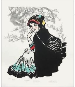 这种阳光的心态始终贯穿于阿鸽的创作,在她后期的版画作品和水墨作品中则表现得更为恣意,明朗轻快的线条与色彩逐渐撇开造型的拘束,不仅表现了彝族女性简洁、生动、奔放的民族个性,同时她本人对生活的用情观察、对自由的向往也在水墨中慢慢晕染开。出生在四川凉山的阿鸽,凭借对家乡生活的熟悉,将更为真挚的情感融入在彝族风情的作品中,尤其是对彝族女孩的刻画,展现出新时代的新面貌。阿鸽的大型水印木刻《奔》和丝网版画《在路上》就曾给版画家李焕民留下深刻的印象,“带有随意性的线条组织”营造出作品《奔》中“向前奔走的真实态势” ,《在路上》通过几根简练的干线和点染其中的灰色描绘了在路途中眺望远方的两位彝族妇女,这种“大写意”的手法“尽管失去了客观的具体真实” ,却得到了“作者主观的感受和不同的艺术呈现” 。李焕民认为,“阿鸽对本民族的文化有深刻的理解,她以自己天生的秉性、后天的修养、创造性的思维能力,提炼出了既有民族文化基础又有时代审美个性的图像,人们一眼就可看出这是阿鸽的作品。她以线为基础,将水印版画的色彩浸润成团块,而面部、眉眼则寥寥几刀,神气活现,不求形似,求神似,刻感觉,刻印象,既有现代感,也有民族感。 ”