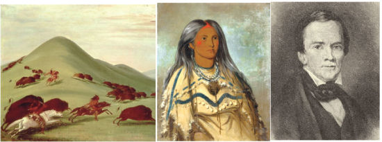 印第安人本是美洲最古老的民族,从16世纪起遭到欧美白人殖民主义者的种族灭绝,玛雅、印加和阿兹特克神秘超验的文明被破坏,劫后余生者或退入 山林,或被驱赶进“保护地”,境况悲惨。美国诗人朗费罗的代表作《海华沙之歌》就是印第安民族苦难的写照。他的同时代人乔治·卡特林(George Catlin,1796-1872)则拿起彩笔描绘早期美洲被欺凌民族的群体肖像,被公认为历史上最富于人道的“印第安画家”。