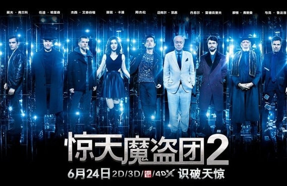 由美籍华裔导演朱浩伟执导,杰西·艾森伯格、伍迪·哈里森、戴夫·弗兰科、丽兹·卡潘、“绿巨人”马克·鲁法洛、迈克尔·凯恩、摩根·弗里曼联合周杰伦、“哈利·波特”丹尼尔·雷德克里夫主演的高智商犯罪动作巨制《惊天魔盗团2》正在以2D、3D、4DX以及中国巨幕格式在内地热映。