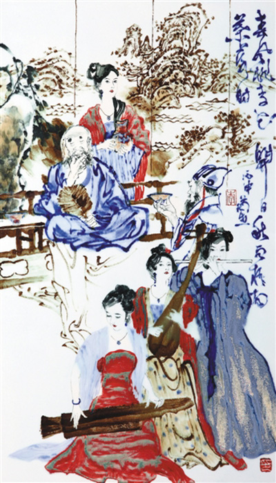 李菊生画“鹦鹉前头不敢言”,画“暗香浮动”,画“出水芙蓉”,画“西域丽人”,画“琵琶行”。这些作品中的女性有的柔美温婉, 楚楚动人,有的矜持内敛,有的羞涩怯懦。歌德说:“羞涩是大自然的一种秘密,用来抑制放纵和欲望,它顺乎自然的召唤,永远和善良、德行和谐一致。”这是女性人性纯真的流露。