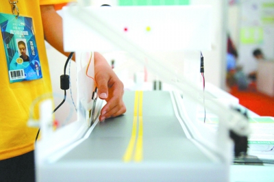7月17日,世界青少年发明展在黑龙江省哈尔滨市举行。来自中国、泰国、马来西亚、日本、印度尼西亚等国家和地区的青少年通过自己的创意发明,展示了各自的奇思妙想。图为中国台湾的学生在展示由其设计的城市内涝停车场自动感应装置。