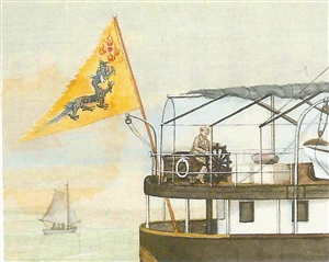 在船上底层甲板上,画有一名手持烟斗的人,他应该就是受慈禧太后派遣一路照顾醇亲王的太监李莲英。