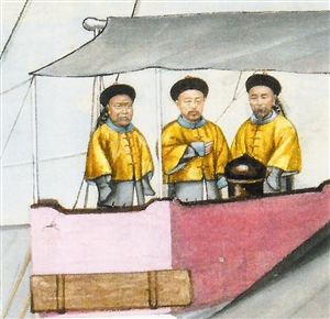 在船的甲板上,画师还画了18个随行官员和杂役,其中有11人是身着紫色马褂的官员。在船艏位置,有三人在天桥前方的前甲板遮阳棚下,两位在安排座位,一人正在翻阅书籍。