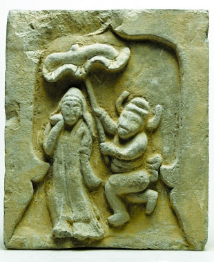 宋代“持荷”画像砖里反映的是七夕之时,年轻男子持荷作伞为女子遮阳避雨。据文献记载,北宋都城汴梁有七夕前后折荷花、荷叶的习俗:“七夕前三五日,车马盈市,罗绮满街,旋折未开荷花……又少儿须买新荷叶执之,盖效颦磨喝乐。”这种蕴藏着生活情趣的场景在宋金画像砖里比比皆是,而文人式的婉约细腻的现实主义韵致也在画像砖中体现得淋漓尽致。