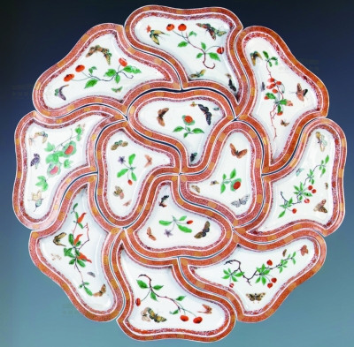此攒盘作于清康熙年间,由内外两层共12件大小盘组成葵花式样。盘折沿,浅腹,平底,圈足。盘内五彩绘花卉蝴蝶纹,沿面红彩描金,盘外壁红彩八吉祥纹,并描金篆书“瘦”字。