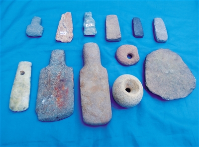 史前石器(新石器时代石拍、石铲子、石斧、石纺轮)。