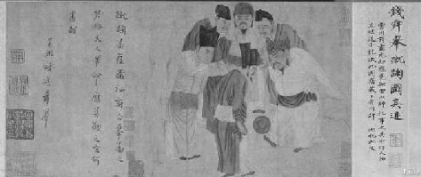 上海博物馆日前在“吴湖帆书画鉴藏特展”中,展出一幅元代画家钱选(款)纸本设色《蹴鞠图》,颇为引人瞩目。此原画传为南宋名家苏汉臣所作,画面设色淡雅,用线古拙,描绘的是宋太祖赵匡胤与其弟宋太宗(赵匡义)及开国功勋赵普、楚昭辅、党进、石守信等玩蹴鞠时的场景。此事在《宋史》和宋代野史笔记中多有记载。