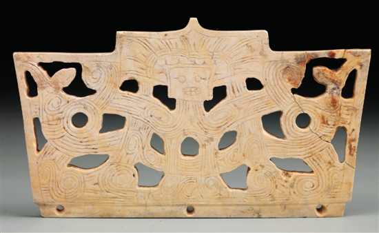 1986年浙江省杭州市余杭区瓶窑镇反山遗址M15出土 玉冠状器为良渚文化时期带有礼仪性质的装饰玉器。该器物平面整体呈宝盖头结构,如同良渚文化晚期的台阶形玉片的结构,冠顶中部切割呈宝盖头结构,下端扁榫上有三个等距的对钻小孔。正反两面以透雕和阴线刻划相结合的技法,对称雕琢肢体俱全的神人图像,填刻光芒线的宝盖头冠帽,倒梯形脸部,单圈眼,一侧刻划眼角,刻划有牙齿的宽嘴。神人上臂两侧各“持”有鸟形象,此部位纹饰或可视为兽面纹的双眼,神人胸腹部位为一般常见的圆拱形结构。两面的纹饰除个别刻划线条的结构有区别外,余均一致。