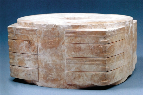 1986年浙江省杭州市余杭区瓶窑镇反山遗址M12出土 该件玉琮重约6500克,形体宽阔硕大,纹饰独特繁缛,为良渚文化玉琮之首,堪称“琮王”。器型外圆内方,上大下小,中间对钻圆孔。琮体四面直槽内上下各琢刻神人兽面图像,整体图案采用浅浮雕和线刻技法雕琢而成。在呈角尺形的长方形凸面上,每两节琢刻一组象征性的神人兽面图案,以转角为中轴线向两侧展开,兽面的两侧还各浅浮雕一变形夸张的鸟纹。玉琮,是良渚文明特有的礼仪重器。它的工艺技术代表了5000年前玉器制作的最高水平;它所体现的用玉制度,揭示了礼仪制度的建立形成,对中国后世“礼制”文化的发展完善产生了深远影响。特别是上面的神人兽面图案,是具有共同信仰的原始宗教重要标志。