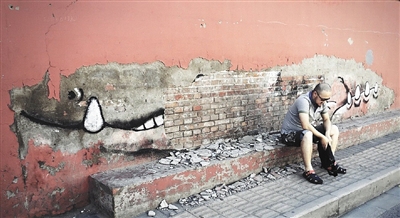 齐兴华利用破损墙面的走势画了条鳄鱼,不久即被破坏,依旧露出丑陋的墙面。
