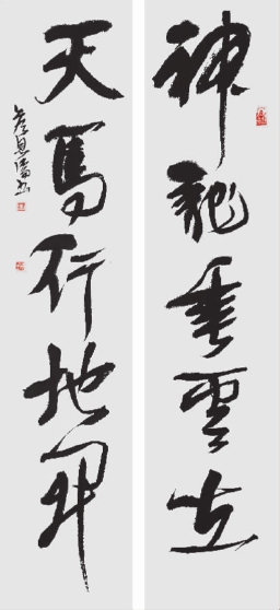 我望着他那一幅幅书写着唐诗宋词、诸子百家哲学、佛学等名篇名言的草书作品,大气雄浑、豪迈旷达、劲健洒脱,纵横天成,像大漠龙卷风,蕴含着狄奥尼索斯的酒神精神,一种壮士舞剑似的英雄气概,一种奔放纵逸的塔里木河自由精神,给人振奋,让人提神,给观者一种酣畅淋漓的痛快。这里有笔墨,有神采,有大格局,是气度轩昂的大漠书法,是浑厚雄壮的长安书法。他的草书形式上走王铎、怀素等古人之路,而精神气韵则出自自己的灵魂。他说: “我就是我!我要写出自己的个性气质! ”