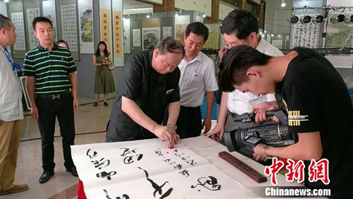 5日,“第七届全国建材行业书画展现场笔会”在北京举行。会上,著名书法家崔承顺、画家王阔海等在现场进行创作。著名相声表演艺术家姜昆亦出席了本次活动。参加本次笔会的知名画家何宝立在接受中新网(微信公众号:cns2012)记者采访时表示,本次笔会在画展中举行的,形式新颖,“受到不少观众的欢迎”。