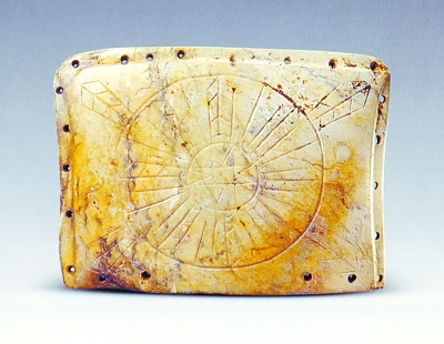 长江中下游和黄河下游的史前遗址中常见八角形符号,很多学者认为这种符号包含了“天圜地方”的含义。尤其是安徽含山凌家滩遗址出土的玉版(上图)。玉版呈长方形,剖面略成拱形,内外两面精磨,其中三条边磨出榫缘,且两条短边各钻有5个圆孔,长边9个,没有榫缘的钻有4个圆孔。玉版正面雕刻两个同心圆,圆中心琢制有一个八角图案,两圆之间以直线平均分为8个区域,每区内各雕琢一枚矢状叶脉纹;外圆与边框之间又雕琢4枚矢状叶脉纹,指向玉版四角。