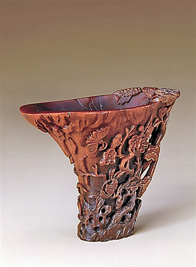 犀角器在古代工艺品中属旷世奇珍,在今天的艺术品市场也价值连城。早在2005年香港苏富比秋拍,一件明末犀角雕双螭海棠形杯以1076万港元首次突破千万大关;2006年纽约苏富比秋拍,一件清康熙尤侃款犀角仙人乘槎杯以203.2万美元成交;2010年香港佳士得春拍,清康熙犀角莱菔尊(“康熙御制”款)和明犀角雕《兰亭序》杯,均以3986万港元的高价,创造了犀角器拍卖世界纪录。