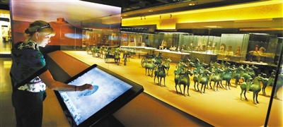 外宾在电子屏上借助影像科技观看武威铜车马360度全景图像。