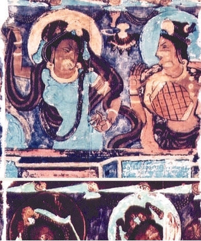 克孜尔石窟第八窟前壁壁画中弹奏五弦琵琶的伎乐天人