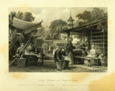铜版画《江南妇女缫丝》,1843年收录于英国版画家阿隆姆出版的有关中国的铜版画集中。画家未到过苏州,而是根据别人的描述加以想象创作。
