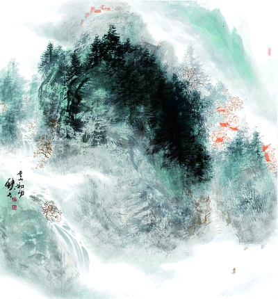 《旭日东升》在画面构图中,画家将岭峰组合、云雾交织、瀑树穿插等表现要素有机联系起来,并将其规律有序地调度在画面上,呈现出群山纵横、层次分明、舒朗有序的局面,给人自然和谐的感觉。在画幅中央位置,近景苍松衬托着中景的主峰,主峰昂首天外呼应着远景的红日,使构图平中见奇,并借助中国山水画中的深远法强化画面空间感,让人似乎置身其境,目睹霞光重岭,感受到旭日东升的艺术境界。