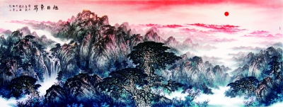在《旭日东升》画作中,比较突出的一点就是画家采用浓烈的朱砂红来表现红日、云空和朝阳下的重重山川,这是此幅佳作中最响亮、最耀眼的一笔。这种设色大大增添了画面装饰感,形成强有力的视觉冲击。这还不止,画家还遵循红日普照山川的自然规律对画面做了添光增彩的渲染,让承天接地的红基调占据了画幅主导位置,成为烘托主题气氛、营造画面意境的得力要素。《旭日东升》画作上鲜艳的红色调连着主题、连着意境,让人激动。试想,若将此幅画面上的朱砂红改变或者减弱,《旭日东升》的艺术感染力将会黯然失色,甚至画面意境将会消退。在中国山水画中,尤其是传统画法中,概念用色是常见的方法,因此,大胆使用主观颜色往往可以获得意想不到的效果。