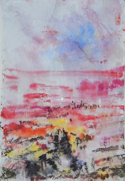 随着对笔法韵律探究的深化,柴祖舜探索的目光由有界跨入意象,由真境的追求跨入幻景的抒发。意象画尤其是心象画,是柴祖舜晚年为向世界现代艺术学习而研创的新画种。这些画作从张大千的金璧泼墨红荷中得到启发,尔后又从现代装饰绘画、抽象绘画中学其所长,进而用水油结合等技法组合而成。