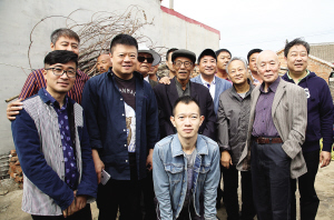 黄庄村的乡亲们确实都在等着呢,好多人老早就聚集在吴家过道前,并且打出了“热烈欢迎马季弟子回恩师故乡”的横幅,道出全村人迎候这批特殊客人的激动心情。车子进村时,面对黑压压一片人群,我对姜昆说:“老宅过道的路不太好走,您就在车里休息吧。”姜昆说:“父老乡亲们这么热情,我哪能不下车!”他抄起拐杖,第一个走下车去。随后,马东也跟着从车里下来,与围拢过来的人们紧紧握手。人群中有人喊:“姜昆,是姜昆,这回可看到真人了!”“马东,马东,欢迎你回家!”刘伟、王谦祥、李增瑞等人也纷纷走下车来,与乡亲们见面。