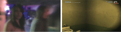除了《视线之外》,还有很多作品的角色表现需要在这方面做特殊的处理。譬如游戏《合金装备:食蛇者》的一段过场动画里,玩家所操纵的角色“裸蛇”斯内克昏厥后被绑在行刑室拷问。斯内克在睁开眼睛之前就已经醒来,但被蒙着黑色头套。过场动画所使用的表现方法非常直接有效:一大段黑场,观众只闻声音,不见画面。同一场戏中,在救女主角夏娃免于一死时,斯内克被子弹打瞎了右眼。此后玩家的游戏过程中若使用第一人称视角,屏幕右半边都带有黑色的虚边。对于《食蛇者》这种可以随时切换第三人称与第一人称视角的游戏作品来说,黑色虚边所起到的认同作用尤其显著。