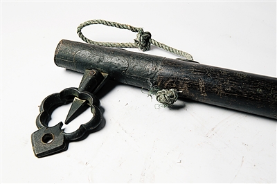“秤”是市井生活中最常见不过的物品,闹市中的喧嚣与你来我往间的“斤斤计较”让不少保存至今的秤杆被“生活”磨损得少了美感。而丁英俊在海口本地收得的这杆老秤品相、造型都流露着几分美意,精致的细节也不难让人看出当年优良的制造工艺。据介绍,这杆约1米75长的秤杆由铁力木制成。其前段由铜包裹,在秤的铁钩上方,六瓣花状结构玲珑有致。当铁钩上挂上物品时,在秤砣的配合下,“花”下端的准星会与中间的准星对准,以此实现计量。