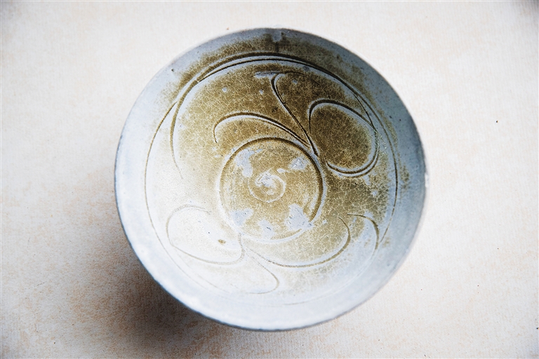 11月9日,广东省文物鉴定站文物鉴定专家谢海山在鉴定潭门渔民捐赠的物件。这是一件五代红斑纹青釉瓷碗。