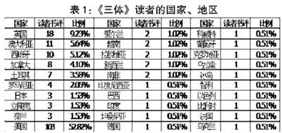 在作品风格和故事情节的分析中,有27.18%的人明确提到了“中国科幻小说”,有28.72%的读者认为“很好”,17.95%的读者认为《三体》是“最好的”“杰出的”小说,三项合计为73.85%,恰好印证了2万多读者给《三体》打出4分、5分的人数比例。可见“中国科幻”小说、“非西方风格”是《三体》赢得世界上这么多读者青睐的主要原因。比如有个英国读者写到:“作为一个英语国家的读者,我读的大部分小说都是西方式的或者英语国家式的。这部小说让我读起来感觉很新鲜,人物不再是常见的美国式的、英国式的或者欧洲式的,也不是澳大利亚式的。读刘慈欣的书,既是阅读一部包含中国历史文化的科幻小说,也是阅读一部不以英语国家和说英语的人物为中心的小说。”有美国读者写道:“没有让我失望,与我读过的科幻小说很不一样,期待阅读下一部。”“我很喜欢这部小说,它充满了令人惊喜的科学概念,此外小说中的观点是非西方式的。”