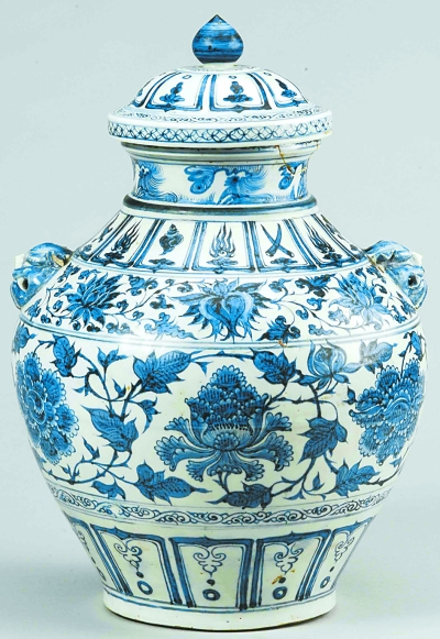 专家还介绍,元朝时,中国与中东地区贸易往来频繁,中东从中国订制了大量青花瓷,而烧造青花瓷所用的钴蓝料则从中东地区进口。这类进口的“苏麻尼”青料含铁量高、含锰量低,成色浓艳青翠,料厚处自然形成内凹状的黑铁斑,黑铁斑和浓艳的青蓝色相映成趣。而这件元青花缠枝牡丹纹兽耳盖罐的花纹,也有很多黑点,这正是高铁渗出来的,就连器物上的很多花叶也出现了这种状况。这些也非常符合元青花的特征。综合各种分析,专家断定这件器物是元代青花瓷。
