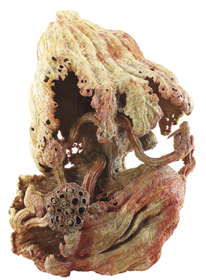 在中国文化艺术史上,在植物意象中花卉意象是比较丰富的。荷花是中国花卉画的一个重要题材。我常年观察荷花的过程中也逐渐喜欢并试着凭借二十多年来对寿山石色彩和雕刻技法的理解,在寿山石上表达自己独特的荷花审美情感。荷花融入诗词,融入音乐,亦融入绘画。荷花既是佛门圣物,象征“出淤泥而不染” ,同时,它又是道教标识,充满了珍祥色彩。而大儒周敦颐的《爱莲说》 ,又赋予荷花高尚的人格魅力。在绘画历史上,八大山人、石涛、扬州八怪、吴昌硕、齐白石、张大千等都是画荷花题材的大家,他们让文人写意画成为花卉画的主流。如果说,选择苍劲的秋荷作为展示我的这一审美情结的载体,是带有几分个人性情的艺术偏爱,那么,在每一件作品的布局谋篇和雕刻的精益求精上,竭力吸取历代绘荷大师名作的神韵,从而力图让作品有一种天然的诗情画意,则是自己苦心竭虑所追求的一大艺术意境。