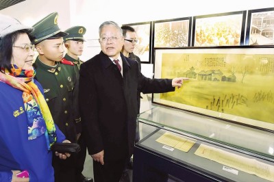 叶永烈向参观者介绍他捐赠的《申江战焰图》,这是日军侵华的有力罪证。本报记者赵立荣摄