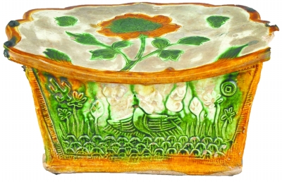 河北省丰宁满族自治县是多民族地区,曾先后有肃慎、山戎、匈奴、库莫奚、契丹、女真、蒙古、满洲等民族聚居,他们在这里创造了灿烂的民族文化,同时也给后世子孙留下了大量的珍贵文物。丰宁博物馆收藏着一件辽代的“三彩瓷枕”(左图)。这件“镇馆之宝”学名是“三彩云头形双碟牡丹纹贴花狮面五角长方形枕”,是辽代的生活用品,目前在全国是唯一一件。右图为“和尚坐罐”,又叫“蟹青釉开光龙凤仙人寿字松鹤纹带盖葫芦顶大瓮”,为元代和尚的丧葬用品,全国也只发现两件。