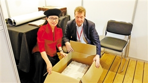 本届古书展顾问钟芳玲与麦格斯兄弟古书店负责人在打包《赛胜猎报》。