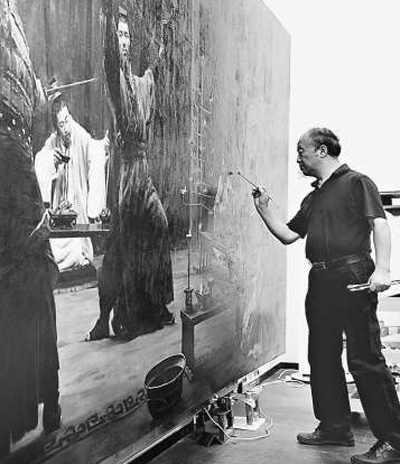 王宏剑在创作《楚汉相争·鸿门宴》。 资料图片
