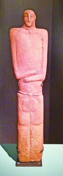 距今6000年的人形石碑是阿拉伯半岛迄今发现的最早最著名的古代人类遗物。展厅中的三件石碑雕像虽然来自半岛的不同地区,但人物造型具有显著的相似性:整体长方,上身较方,锁骨高耸,双臂交叉,整体造型风格显著,具有强烈的表现力。三尊雕像在衣着、神态风格上迥异,或许代表着古代阿拉伯半岛不同村落和部族之间存在的风俗差异。