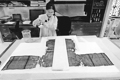 出土后“干时一把土,湿时一捧泥”,丝绸文物的保存是国际性难题。中国丝绸博物馆和浙江理工大学用了将近十年的时间,研发出了一种神奇的丝织物加固技术。就像女人用睫毛膏轻轻一刷,睫毛立刻加长加密一样,用丝织品加固液轻轻一喷,原来脆弱的丝织品就结实了。丝织品加固液所使用的原料本身就是丝的分解物,叫作丝肽—氨基酸,因此在手感、质地上,不会造成任何异样感,被加固过的丝织品不仅外观上没有改变,摸起来手感也更加光滑细致,更加牢固,即使水洗,也不影响加固效果。这项国际首创的技术很快就受到国外同行的青睐,丹麦就用它加固女王漆器上的丝带,效果很不错。