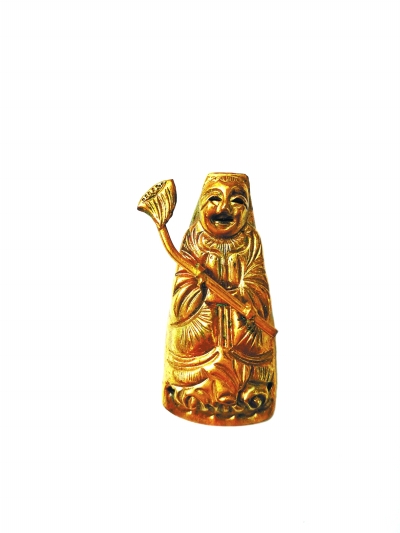在“嘉树堂”里,有一类金属器物看似不起眼儿,但做工很考究,最小的只有指尖大小,也被他戏称为“小人物”。贾树介绍说,“小人物”可不简单,人物是立体的,制作工序不比大的佛造像省事。工匠先把熔炼出来的铜块,用小锤反复敲打制成铜皮薄片,再将铜片放在一个制作好的模具上,继续敲打成形,人物的脸部、身体、衣服的花纹都要通过精细的錾刻、鎏金工艺,成品栩栩如生,每根胡须都能看得分明真切。“小人物”可分为纯铜、铜鎏金、银鎏金、纯银制作,材质不同,大小各异。