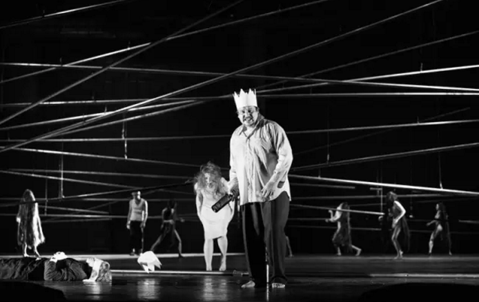 斜横交错的线条,空的舞台,水,水桶,也许是皇家宴席中的瓶子,刀,还有纸作的王冠,凡此种种,重新定义了《麦克白》里的世界。