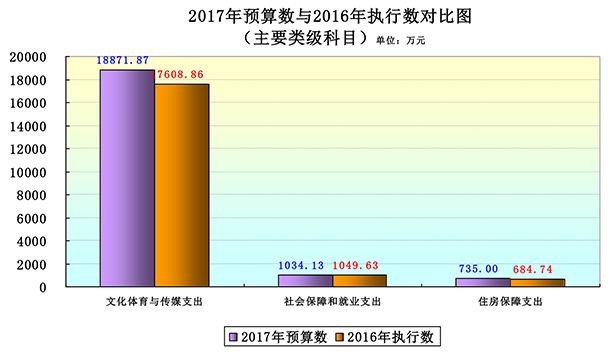 (一)文化体育与传媒支出(类)2017年年初预算数18871.87万元,比2016年执行数增加1263.01万元,增幅7.17%。其中: