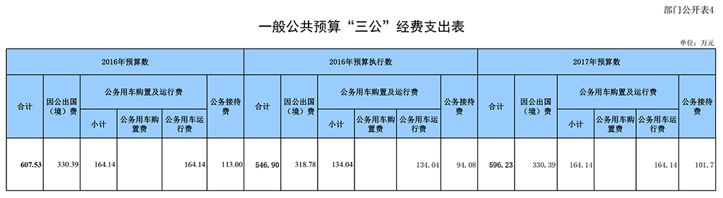 2017年“三公”经费财政拨款预算596.23万元,比2016年预算数减少11.3万元,主要是中央财政对2017年公务接待费支出进行了统一压减。其中:因公出国(境)费330.39万元,与2016年预算数相同;公务用车购置及运行费164.14万元,与2016年预算数相同;公务接待费101.7万元,比2016年预算数减少11.3万元。