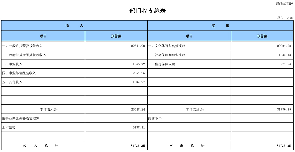 收入包括:一般公共预算拨款20641万元,上年结转 4929.11万元。支出包括:文化体育与传媒支出23775.64万元,社会保障和就业支出1034.13万元,住房保障支出760.34万元。