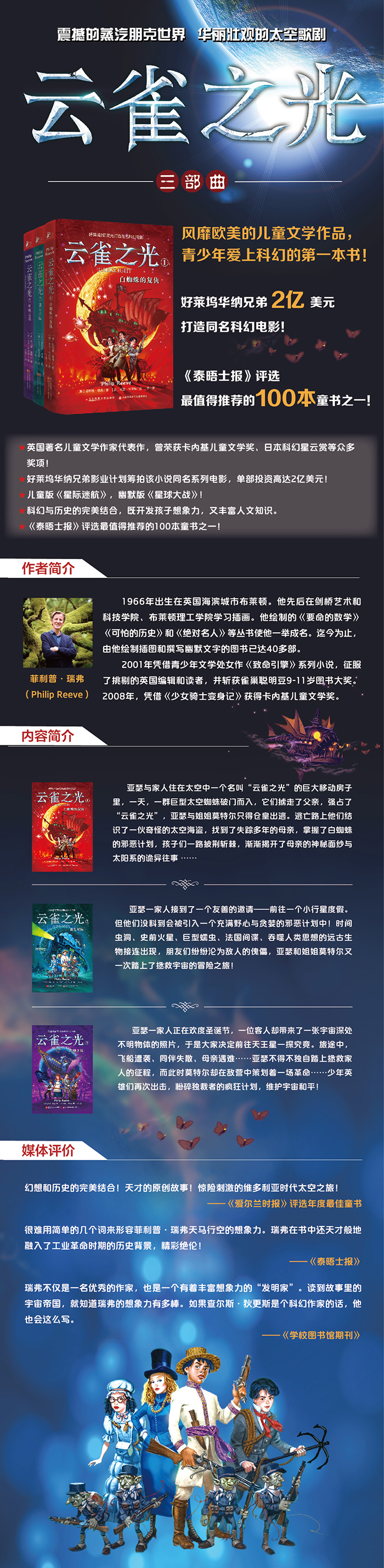 好莱坞2亿美元打造同名科幻电影!《泰晤士报》评选值得推荐的100本童书之一。真实的历史背景,震撼的蒸汽朋克世界,华丽壮观的太空歌剧!青少年爱上科幻的书!