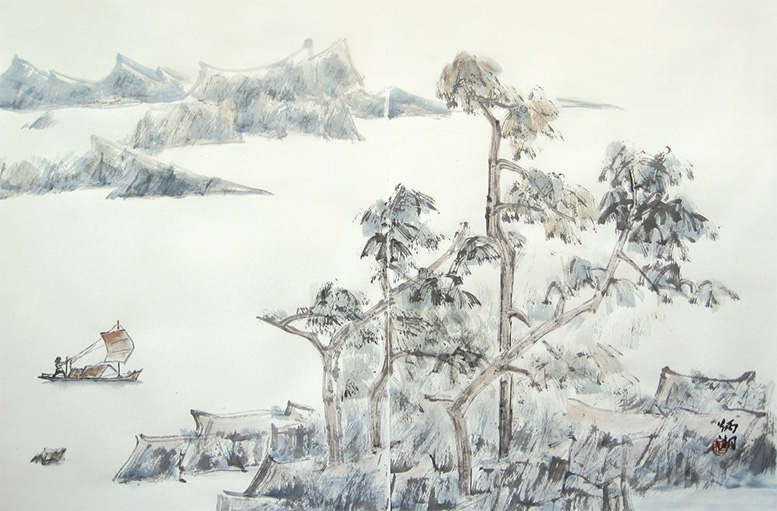 品读杨炳湘之作品,则情不自禁地为她的笔墨精妙而心动。如《山里人家》《轻舟》《夕照》《渔》等之恬淡静谧,淳朴民心、淳厚乡情、比比乃心境安适之一隅世外田园,卸下世间红尘之喧嚣嘈杂与纷争,回复心灵之淡泊平和,《云岭山居》《岭上》《山家》等作品,设色简净、晕染皴擦,近实远虚,肌理节奏,层次分明,画面幽深凝重,意境深远绵长。或许此乃炳湘心向往之“诗意栖居”及心灵归隐之所也。画中万千气象,早已脱离古人窠臼,实为大虚大实、浑莽氤氲之灵构,耀动的点线、团块的水墨与自然机巧的露白布虚相映成趣,表现了一种山川的腾虚之象,给人以“象外有象”的美感和无尽的遐思。一句话,笔参造化,已得山水真趣。