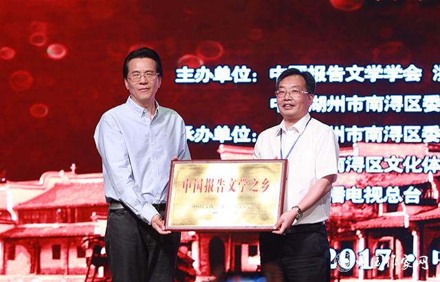 中国报告文学学会授予南浔“中国报告文学之乡”称号,电竞竞猜副主席何建明为其授牌,中共湖州市南浔区委书记夏坚定上台接牌 摄影:王纪国