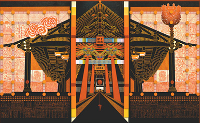 二是作品内涵与形式语言要相谐相生。创作中,将中华木构建筑作为画面中心的主体,参考宋《营造法式》“大木作”图样,集合中国古代建筑最具特色的造型样式:斗拱、梁柱结构、大屋顶等,并突出其形体,意象表现出中华建筑文明的内涵——既为生存之基础,亦为精神之栖所。
