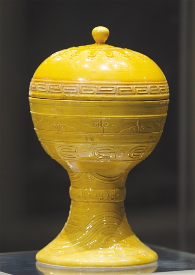 光绪款黄釉带盖瓷豆。