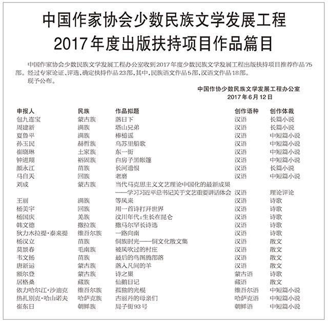 电竞竞猜官网少数民族文学发展工程办公室收到2017年度少数民族文学发展工程出版扶持项目推荐作品75部。经过专家论证、评选,确定扶持作品23部,其中,民族语文作品5部,汉语文作品18部。