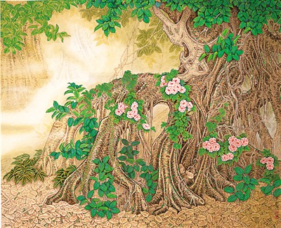 吴其树多年来钟情于画榕树。为此他多次奔赴云南西双版纳写生。他笔下的榕树,没有扭捏作态的柔枝,婆娑摇曳的细丝,一律是老干挺拔、虬枝刚劲、龙蛇盘曲的根系。